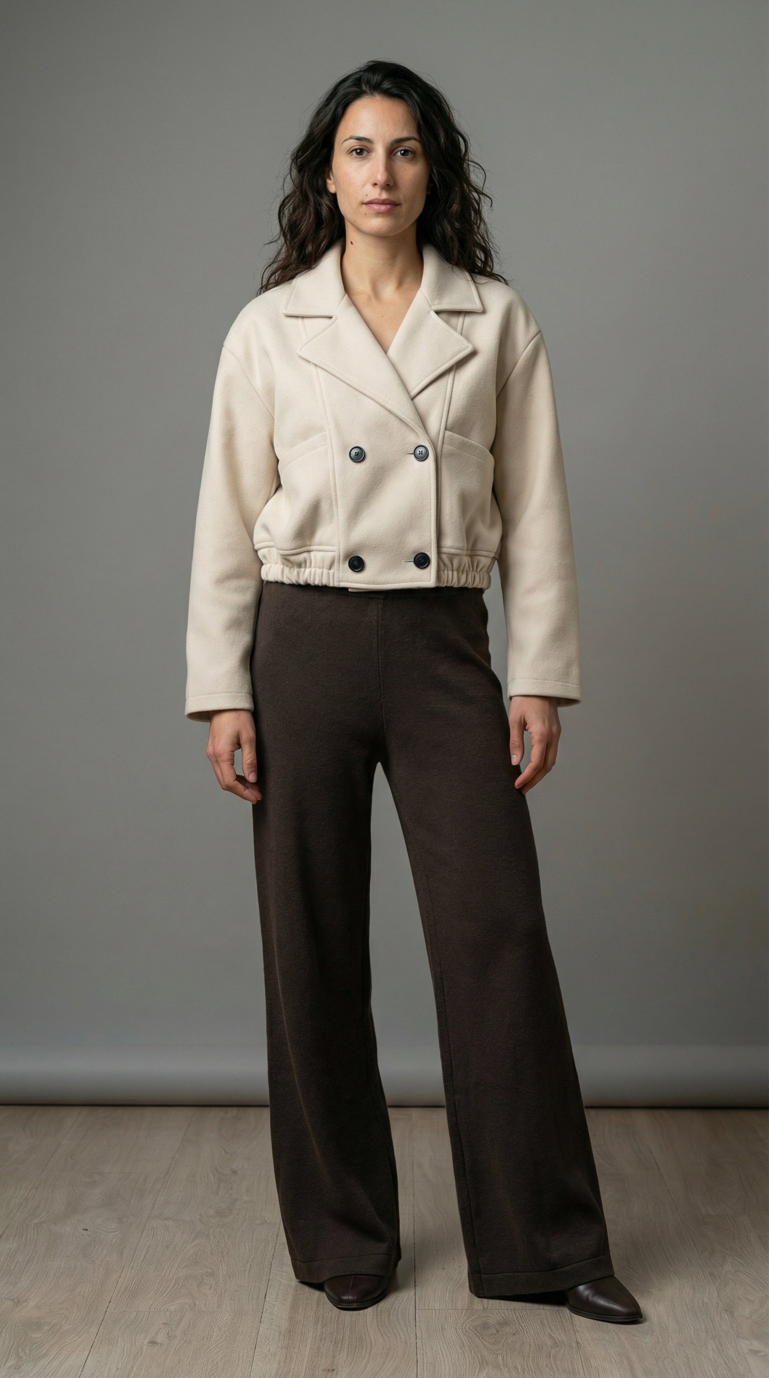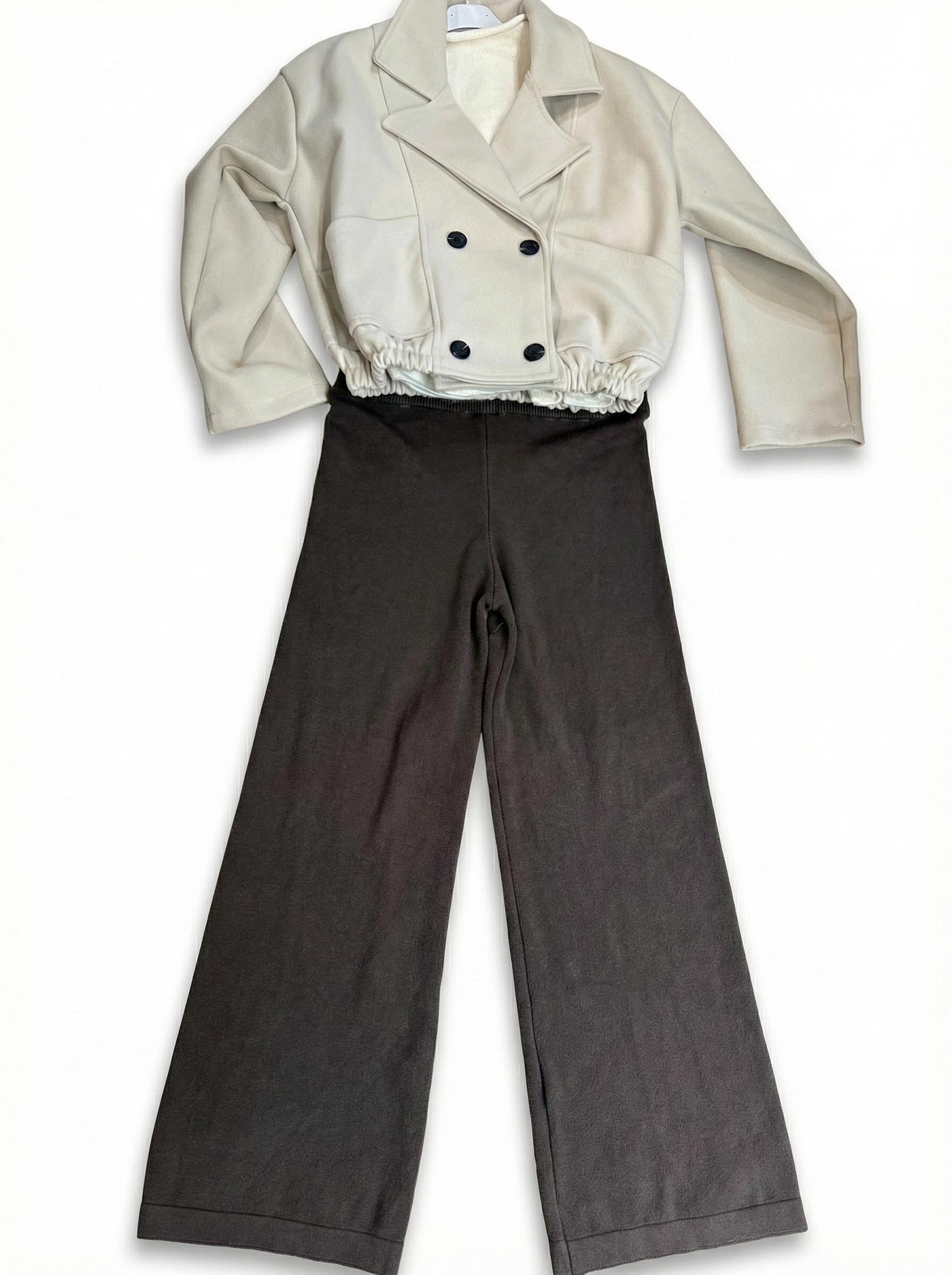 Rinnova il tuo guardaroba con questo elegante set coordinato che unisce stile contemporaneo e comfort assoluto. La giacca corta doppiopetto color panna è il pezzo forte, caratterizzata da un tessuto caldo e strutturato, un ampio colletto di tendenza e un originale fondo elasticizzato che crea una silhouette moderna. Si abbina perfettamente ai fluidi pantaloni palazzo marrone scuro, realizzati in morbida maglia con una pratica vita elasticizzata. Un completo versatile: perfetto indossato insieme per un look sofisticato, oppure spezzato per creare molteplici outfit. Ideale per chi cerca un'estetica casual-chic senza rinunciare alla comodità.